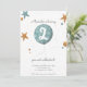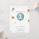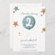 Adorable et simple invitation d'anniversaire de deux ans avec une illustration amusante d'un ballon bleu et d'étoiles. Illustré et dessiné par Patricia Alvarez.