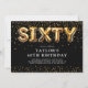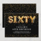 Invitation moderne pour 60e anniversaire avec un fond noir élégant, une dispersion de confettis dorés, des ballons en hélium dorés qui écrivent "soixante", et un modèle de texte de fête élégant facile à personnaliser.