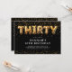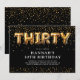 Invitation pour un 30e anniversaire moderne avec un fond noir élégant, une dispersion de confettis dorés, des ballons en hélium dorés qui épellent "trente", et un modèle de texte de fête élégant facile à personnaliser.