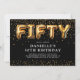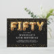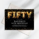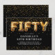 Invitation moderne pour les 50 ans avec un fond noir élégant, une dispersion de confettis dorés, des ballons en hélium dorés qui écrivent "cinquante", et un modèle de texte de fête élégant facile à personnaliser.