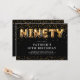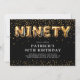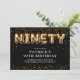 Invitation moderne pour les 90 ans avec un fond noir élégant, une dispersion de confettis dorés, des ballons en hélium dorés qui épellent "quatre-vingt-dix", et un modèle de texte de fête élégant facile à personnaliser.