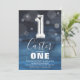 Invitation moderne de fête de premier anniversaire conçu avec un arrière - plan bleu eau sombre, confetti de bulle transparente, et un grand ballon d'hélium numéro un en argent. Le nom de l'enfant est écrit en gros texte calligraphie blanc avec un simple modèle d'anniversaire en dessous qui est facile à customiser.