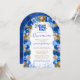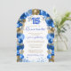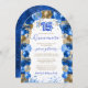 Cette élégante invitation Quinceañera présente une parties scintillant étincelante arc de ballon dans différentes nuances de bleu et d'or avec ballon 15. Des banderoles et des confettis en bleu et or complètent l'ambiance du parti. Le dos est orné d'un arrière - plan bleu royal pétillant. Facile à customiser en cliquant sur "Personnaliser".