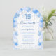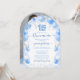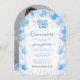 Cette élégante invitation de Quinceañera présente une arche en montgolfière scintillante à parties scintillant dans différentes nuances de bleu, d'argent et de blanc. Des banderoles et des confettis en bleu et blanc complètent l'ambiance du parti. Le dos présente votre photo préférée. Facile à customiser en cliquant sur "Personnaliser".