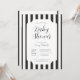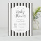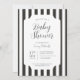 Invitation classique et intemporelle pour baby shower en noir et blanc à rayures. Styles de police et disposition personnalisables, avec un fond à motif simple avec des rayures de marquise verticales linéaires et épurées. Parfait pour les invitations de baby shower unisexes, les invitations de baby shower pour garçon, et les invitations de baby shower minimalistes.