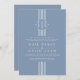 Bandes blanches et initiales faire-part de mariage bleu poussiéreux. Il affiche des rayures verticales blanches au centre avec un cercle avec vos initiales et deux petits coeurs et votre texte. Le dos est de couleur bleu foncé.