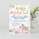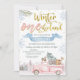 Bannière de camion rose Winter Onederland 1er anniversaire Invitation Les filles hiver onederland invitation de premier anniversaire mettant en vedette des animaux de forêt dans un camion rose, bannière bleue, pins et flocons de neige.