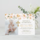 Célébrez le baptême de votre fils ou de votre fille avec notre belle, moderne et élégant baptême & 1er anniversaire invitation. Nos caractéristiques de design Nos belles fleurs d'aquarelle dessinées à la main qui encadrent le haut de l'invitation et un espace réservé photo pour afficher votre propre photo. Une élégante croix en faux or décorative est incorporée au design. Customisez avec les détails de votre événement. L'envers présente un beau motif floral couleur eau. Toutes les illustrations sont dessinées à la main par Moodthology.