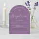Une simple invitation de baptême moderne, en forme d'arche, neutre en termes de genre. Elle n'a que du texte blanc sur un fond violet poussiéreux. Dans la partie supérieure, il y a une croix blanche avec du texte arqué au-dessus. L'occasion et le nom sont écrits en écriture cursive.