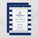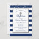 Invitations élégantes et modernes BAPTISM CHRISTENING. Conception avec confetti en faux argent et arrière - plan bleu marine et rayures blanches. Traversez au milieu. Tout le texte peut être modifié avec la police et la taille. N'oubliez pas d'obtenir les autocollants de faveur correspondants.