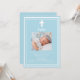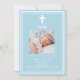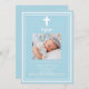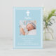Un arrière - plan bleu clair, décoré d'un cadre blanc, et d'une croix blanche Personnalisez et ajoutez un nom photo et des détails. Texte blanc.