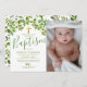Des invitations de baptême/baptême sans distinction de genre avec un arrière - plan blanc classique qui peut être changé à n'importe quelle couleur, des branches d'aquarelles avec feuillage vert luxuriant, une croix d'or religieuse, une photo de votre enfant, et un modèle de texte moderne facile à personnaliser.