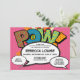 Un livre de bande dessinée rose, cool et tendance a inspiré le baptême, invitation à baptiser qui met le wham, zap, pow dans l'événement de célébration de votre super-héros. Le verso comporte une bande dessinée rose poka motif et la bulle de discours pour plus de détails sur l'événement et l'adresse. Conçu par Thisisnotme©