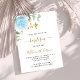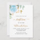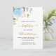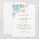 Un fond blanc décoré de verdure d'eucalyptus, une rose bleu clair et des feuilles dorées. Personnalisez avec le nom de l'enfant et les détails de la cérémonie. Lettres de couleur noire et dorée.