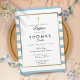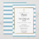Invitation simple de baptême à rayures bébé bleu avec une croix dorée et une bordure élégante de faux papier doré qui encadre vos détails dans une typographie moderne. Conçue par Thisisnotme©