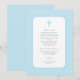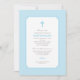 Invitation de baptême ou de christening simple et douce pour un bébé garçon avec un fond bleu bébé et un panneau de texte blanc placé à l'intérieur d'un cadre décoratif classique à encoches et accentué par une croix bleue et une fioriture élégante. Le nom du bébé est affiché dans une police grasse avec des accents de script partout. Tout le texte et la couleur de fond peuvent être entièrement personnalisés pour votre cérémonie et votre événement de célébration.