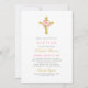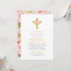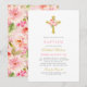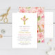 Conception élégante d'invitation de baptême ou de baptême de bébé fille comporte une croix décorative dorée avec un bel arrangement floral aquarelle de fleurs de dahlia et de rose pastel rose, blush et pêche avec un feuillage doux. Le texte élégant rose, or et gris peut être entièrement personnalisé pour votre événement. Un fond rose clair avec un motif floral aquarelle coordonné habille le dos de la carte.