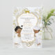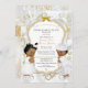 Belle petite fille & garçon dans leurs vêtements de baptême avec collier de croix d'or. Invitation arrière - plan est satin blanc, filigree or, cadre parties scintillant or et argent et embellissement arc. Le dos est orné de motif de fleurs dorées et de ruban doré sur un arrière - plan satiné blanc.