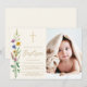 Cette invitation de photo de baptême floral présente des fleurs sauvages et une croix avec une typographie de script doré élégant sur un fond crème doux.
