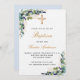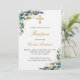 Un arrière - plan blanc décoré de verdure d'eucalyptus, de feuilles dorés et d'une croix d'or. Personnalisez et le nom des enfants et les détails de la cérémonie. Lettres noires et dorées. Dos : bleu clair arrière - plan.