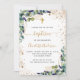 A white background decorated with eucalyptus greenery and golden leaves and faux gold glitter dust. Personalize and the childs name and ceremony details. Black and golden colored letters. Back : White background with golden faux glitter dust.