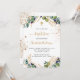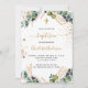 Un arrière - plan blanc décoré de verdure d'eucalyptus et de feuilles dorés et de parties scintillant en faux or tombe. Personnalisez et le nom des enfants et les détails de la cérémonie. Lettres noires et dorées. Retour : arrière - plan blanc avec gouttes de parties scintillant en faux or