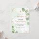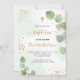 Un arrière - plan blanc et vert clair décoré de verdure d'eucalyptus et de poussière de parties scintillant en faux or. Personnalisez et le nom des enfants et les détails de la cérémonie. Lettres noires et dorées. Non sexiste.