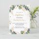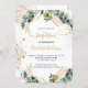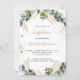 Un arrière - plan blanc décoré de verdure d'eucalyptus et de feuilles dorés et de parties scintillant en faux or tombe. Personnalisez et le nom des enfants et les détails de la cérémonie. Lettres noires et dorées. Retour : arrière - plan blanc avec gouttes de parties scintillant en faux or