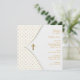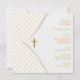 Élégante invitation de baptême et de christénée bébé fille avec pois roses, croix blanche et or.