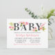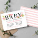Cette invitation de baptême horizontale moderne met en valeur le mot de titre gras "Bébé" couronné de fleurs d'aquarelle rose saumon, de teintes pastel rose, et de fleurs de dahlia et de rose aux tons pêche avec feuillage vert de printemps. L'écriture calligraphique rose met en valeur le nom de l'héroïne pour un look doux et féminin. Le dos rayé rose et blanc ajoute un détail de coordination ludique. Tout le texte est entièrement modifiable pour personnaliser votre célébration.