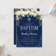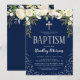 Cartes d'invitation modernes pour baptême ou christening avec un fond bleu marine pouvant être modifié à souhait, paillettes argentées élégantes, une croix religieuse, une composition florale et un modèle de texte facile à personnaliser.