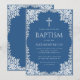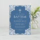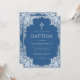 Cette invitation de baptême bleu classique avec une atmosphère vintage, recommandée pour un garçon, comporte un cadre en faux feuillet d'argent orné de feuilles gris argenté sur un fond bleu classique. Au-dessus du texte, il y a une croix religieuse en faux feuillet d'argent. Tout le texte peut être personnalisé et a une couleur grise similaire au cadre en faux argent.