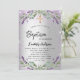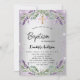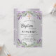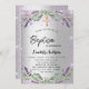 Une invitation moderne, élégante et glamour pour un baptême célébrant une petite fille. Un arrière - plan faux argenté avec parties scintillant violette, étincelants, fleurs de lavande, fleurs et végétation d'eucalyptus. Le nom est écrit avec un script de style moderne écrit à la main. Personnalisez et ajoutez vos détails.