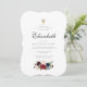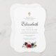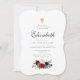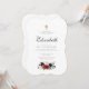 Le design se compose d'un script cursif classique et d'une typographie serif qui est élégante et simple. Un bouquet de fleurs bordeaux à l'aquarelle et une fausse croix d'or ornent l'invitation.