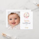 A modern and elegant baptism thank you card. A chic white background decorated with a watercolored pink and ivory floral wreath, a bow and a golden cross. Personalize and add your photo of the child, thank you note and name.