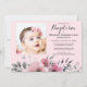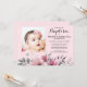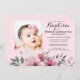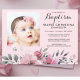 Une élégante invitation au baptême photo que vous pouvez personnaliser et envoyer à vos invités pour votre célébration de baptême. Tous les textes sont définis à l'aide de la typographie populaire. Un motif floral vient compléter le design dans les tons rose et gris sur un arrière - plan rose doux. Bon appétit !