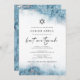 Cette élégante invitation à la bat-mitzvah présente une bordure aquarelle bleu clair imitant le marbre veiné de feuille d'argent fausse, s'estompant progressivement dans le fond blanc. Les mots "bat mitzvah" apparaissent en écriture manuscrite gris charbon, le reste du texte en majuscules serif. Le motif marbré bleu et argent est répété au dos de la carte.