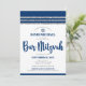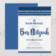 Soyez fier, réjouissez-vous et mettez en valeur ce jalon de votre Bar Mitzvah préféré ! Envoyez cette invitation unique, moderne et personnalisée pour un événement inoubliable. Une typographie de script gras et bleu marine, l'étoile de David et un graphique inspiré du tallit rayé de bleu marine et d'argent scintillant se superposent sur un fond blanc simple. Personnalisez le texte personnalisé avec le nom de votre Bar Mitzvah, la date et les informations sur le lieu. Garantit d'ajouter un plaisir élégant à son occasion spéciale !