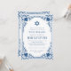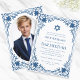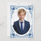 Cette élégante invitation de bar mitzvah à l'atmosphère vintage présente un cadre orné avec des décorations baroques élégantes. Au-dessus du texte se trouve une étoile de David. L'étoile, le cadre et le texte sont d'un bleu classique, le fond est blanc. Au dos, il y a une photo ovale de remplacement à l'intérieur du même cadre vintage.