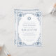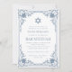 Cette élégante invitation à la bar mitzvah à l'air vintage présente un cadre orné avec des décorations baroques élégantes. Au-dessus du texte se trouve une étoile de David. L'étoile, le cadre et le texte sont bleu poussiéreux, le fond est blanc. Au dos, il y a une photo ovale de remplacement à l'intérieur du même cadre vintage.