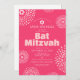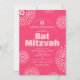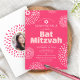Soyez fiers, réjouissez-vous et mettez en valeur ce jalon de votre Bat Mitzvah préférée avec cette invitation personnalisée amusante, tendance et funky ! Des éclats d'étoiles floraux rétro blancs et rose blush avec des étoiles de David, ainsi qu'une typographie sans empattement moderne et audacieuse rose blush et blanche, se superposent sur un fond rose corail vif. Au verso, la photo de votre choix et un éclat d'étoile floral rose corail sur fond blanc. Personnalisez le texte personnalisé avec le nom de votre Bat Mitzvah, la date, les informations sur le lieu et la photo. Garantie pour ajouter une touche de style amusant à son occasion spéciale !