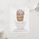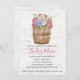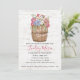 Baril de vin invitation de douche nuptiale avec fleurs colorées et écriture manuscrite. Bois rustique et tonneau plein de fleurs colorées, invitation à la douche nuptiale.