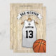 invitations décontractées à la fête de mitzvah avec un arrière - plan de terrain de basket, un maillot blanc avec votre nom d'enfant, numéro et la star de david. Au verso se trouve le bar mitzvah détails de célébration avec un basket-ball au fond.