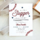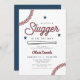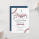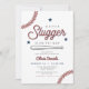 Cette invitation de fête de naissance de bébé petit slugger présente des étoiles bleues, des polices rouges et des graphiques sur le thème du baseball. Cette invitation est l'ajout parfait à votre événement de bébé sur le thème du baseball.
