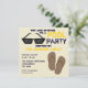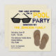 Une invitation de réception au bord de la piscine comportant une illustration d'une paire de lunettes de soleil noires en haut est partie et une paire de bascules électroniques brunes en bas juste. Personnalisez le texte jaune et bleu-foncé avec des détails de votre occasion.