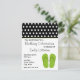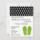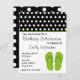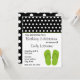 Un invitation de fête d'anniversaire comportant une frontière noire avec le pois blanc en haut avec l'équilibre vert. L'illustration d'une paire de bascules électroniques vertes en bas redressent. Personnalisez le texte noir avec des détails de votre occasion. Le bord opposé est noir avec les points blancs. Affranchissement et étiquettes de adresse assortis Look for chez Paperie de Jill.
