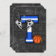Design de basketball amusant pour le jeune joueur de basketball ou fan de basketball. Présente la lettre T dans les couleurs d'équipe bleues et blanches avec des baskets de basketball et un basketball. Le fond présente un design de tableau noir avec des termes et des images de basketball