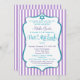 Une élégante invitation Bat mitzvah en violet et turquoise, avec des rayures violettes et blanches et un cadre de parties scintillant turquoise avec une turquoise parties scintillant Star of David. Le cadre de texte de parties scintillant de cet invitation Bat mitzvah classique et classe présente une ombre pour donner un aspect surélevé.
