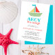 Style rétro coloré voilier nautique thème "Ahoy c'est un garçon" invitation baby shower en bleu et rouge turquoise vibrants.