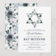 Invitation élégante pour célébration de mitzvah avec un fond blanc simple qui peut être changé en n'importe quelle couleur, une étoile de David florale aquarelle bleue, et un modèle de bat mitzvah moderne facile à personnaliser.